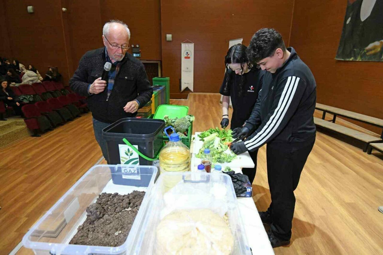 Şehit Erol Olçok Mesleki ve Teknik Anadolu Lisesi’nde düzenlenen seminere; Osmangazi Belediyesi Gazi Tarım Genel Müdürü Arca Atay, Osmangazi Belediyesi İklim Değişikliği ve Sıfır Atık Müdürü Rüveyşa Burça Sütcüoğlu, belediye meclis üyeleri ile çok sayıda öğrenci katılım gösterdi. Programda konuşan Rüveyşa Burça Sütcüoğlu, doğal kaynakların sınırlı olduğuna dikkat çekerek artan nüfusla birlikte atık miktarının da hızla yükseldiğini belirtti. Bunun yanı sıra seminer kapsamında Sütcüoğlu; atıkların kaynağında ayrıştırılmasının çevreye katkıları, gıda israfının önlenmesinin ekonomik ve ekolojik önemi ile sürdürülebilir tüketim alışkanlıklarının günlük yaşama nasıl entegre edilebileceği konularında öğrencilere detaylı bilgiler verdi.
