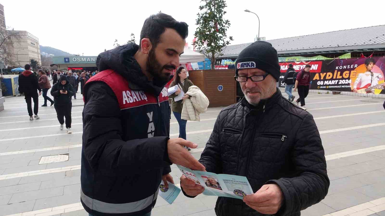 Bursa İl Emniyet Müdürlüğü Asayiş Şube Müdürlüğü’ne bağlı Dolandırıcılık Büro Amirliği ekipler ile Yunus timleri, şehrin en yoğun insan kalabalığının bulunduğu bölgeler ile noter önlerinde dolandırıcılık olaylarına karşı broşür dağıtarak halkı bilgilendirdi. Şehir merkezinde ekipler yaklaşık 2 bin 579 broşür dağıttı. Vatandaşların bu durum karşısında memnuniyet duyduklarını ifade etti.