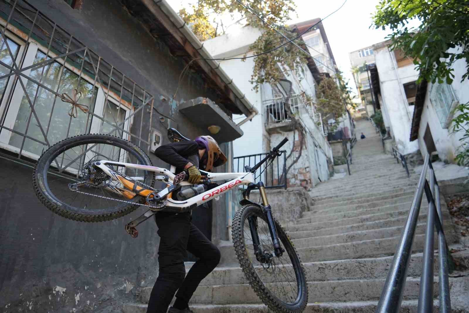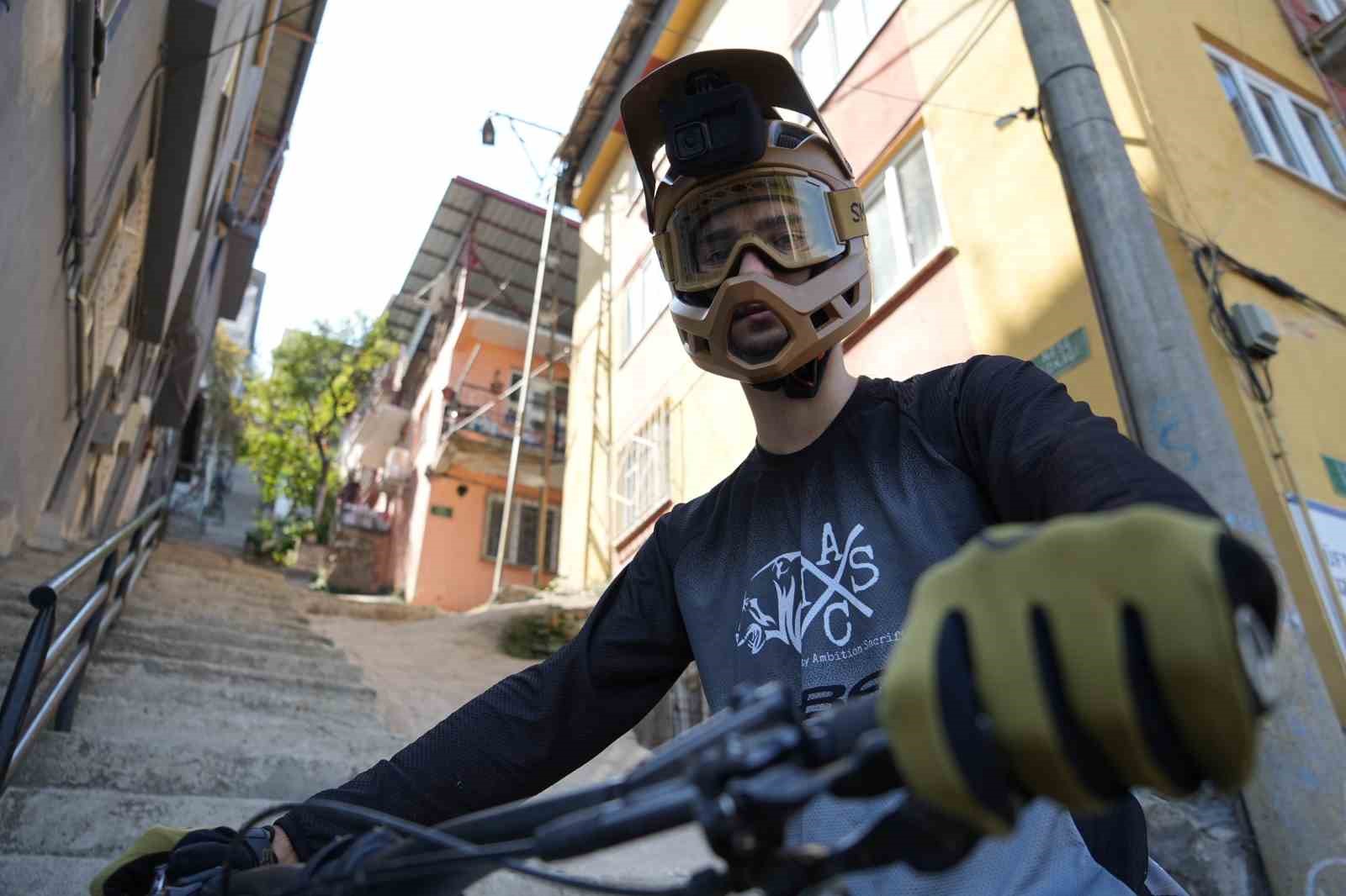 Bursa’da downhill sporcusu 225 basamaklı dik merdivenden bisikletle inişiyle yürekleri ağza getirdi. Uludağ’ın eteklerindeki en dik ve en uzun merdivenlerden saniye içerisinde inen genç sporcu o anları saniye saniye kaydetti.
