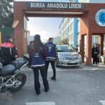 Bursa İl Emniyet Müdürlüğü’ne bağlı Asayiş Şube Müdürlüğü Motosikletli Polis Timleri Büro Amirliği ekipleri ile Çocuk Şube Müdürlüğü’ne bağlı ekipler, il genelinde okul önleri ve çevrelerinde şüpheli şahıslar ve araçlara yönelik “Huzurlu Eğitim” uygulaması gerçekleştirdi. Polisler, okul ve çevresinde şüpheli gördüğü kişileri ve araçları durdurarak üst araması, araç araması ve Genel Bilgi Taraması (GBT) yaptı. Öğrenci ve veliler uygulamalar nedeniyle memnuniyet duyduğu ifade etti.