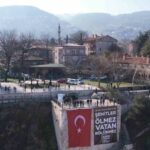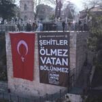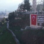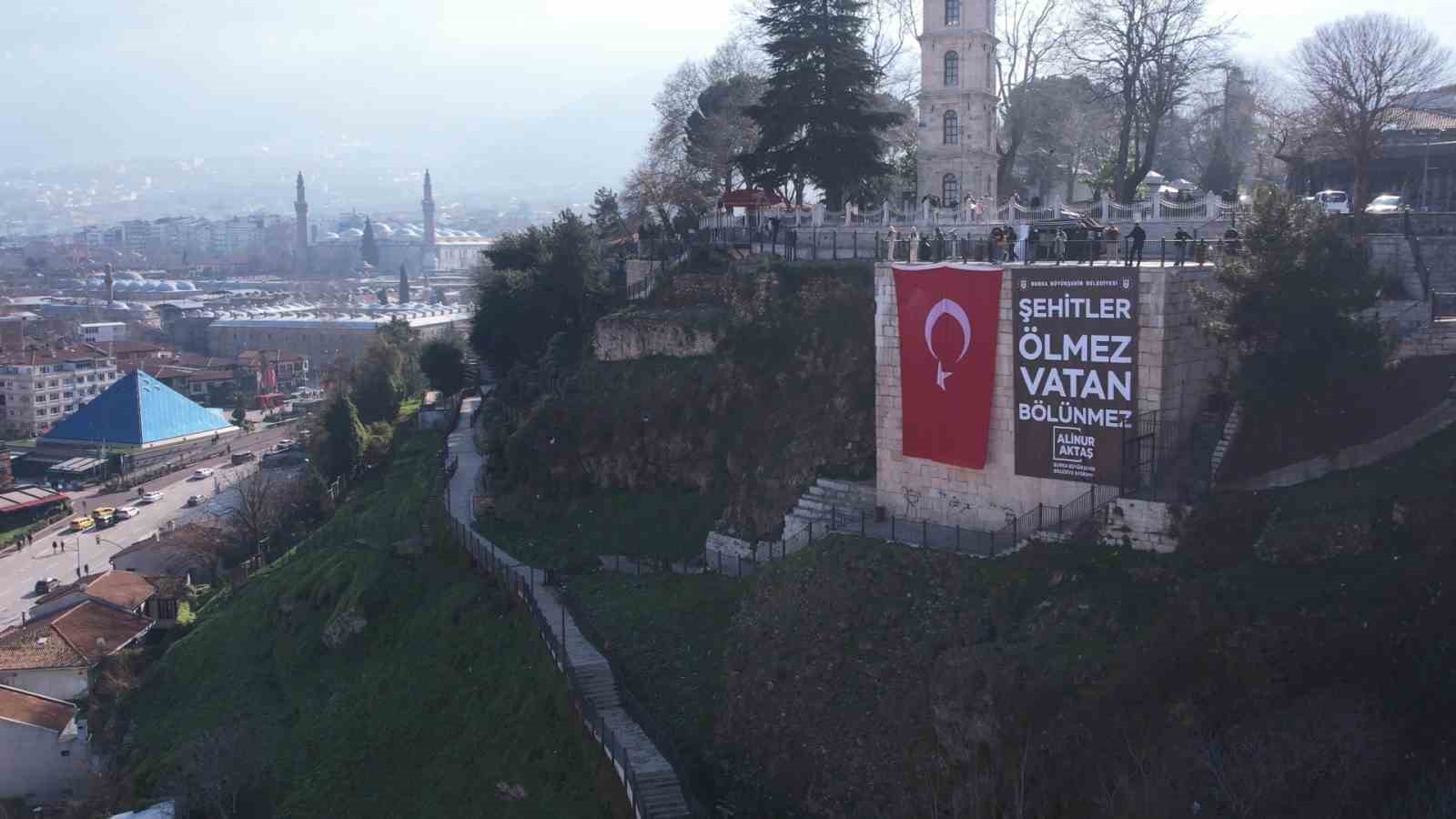 Bursa’da 2700 yıllık Tophane surlarına dev “Şehitler ölmez, vatan bölünmez” pankartı ve Türk Bayrağı asıldı.