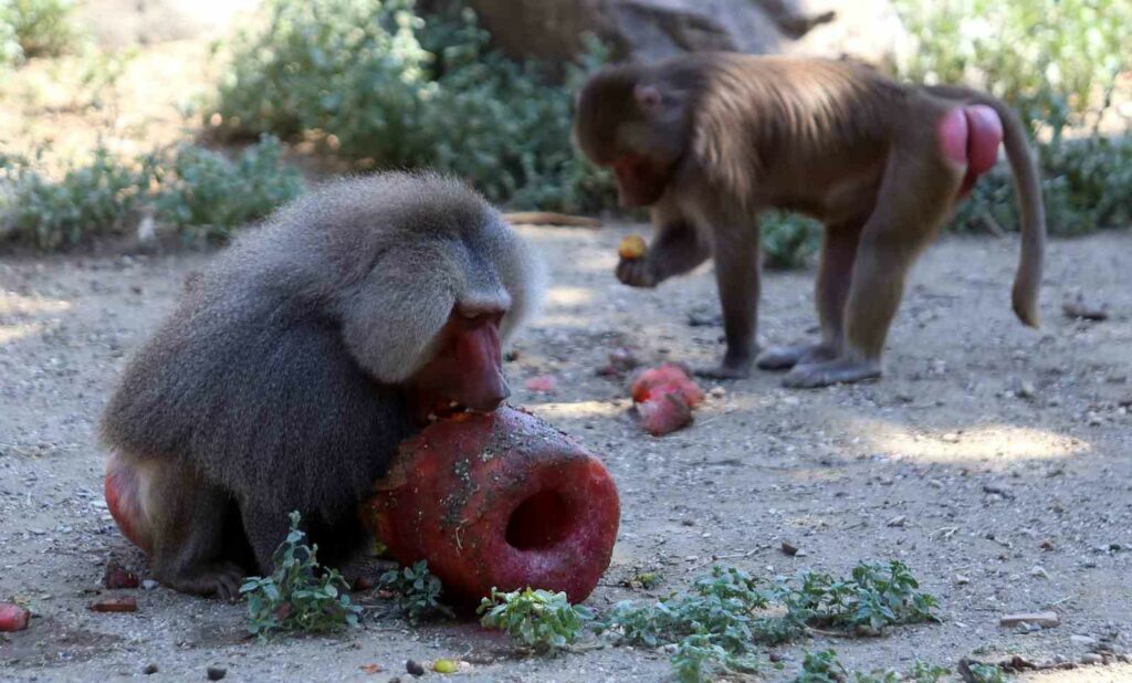 Bursa Hayvanat Bahçesi’ndeki veteriner ekipleri, Dünya Dondurma Günü dolayısıyla Habeş Maymunlarına meyveli dondurma hazırladı. Maymunların hastalık riski nedeniyle endüstriyel üretim dondurmaların sakıncalı olduğunu ifade eden veterinerler, beslenme programlarına uygun doğal meyvelerden oluşan dondurmaları özenle hazırladıklarını belirtti. Hava sıcaklıkları 35 derecelere ulaşırken, maymunlar sıcak havada buz gibi meyveli dondurmanın keyfini çıkartmak için adeta birbirleri ile yarıştı. Hayvanat bahçesini ziyaret eden çocuklar ise ilk kez dondurma yiyen maymunları görmenin şaşkınlığını yaşadı.