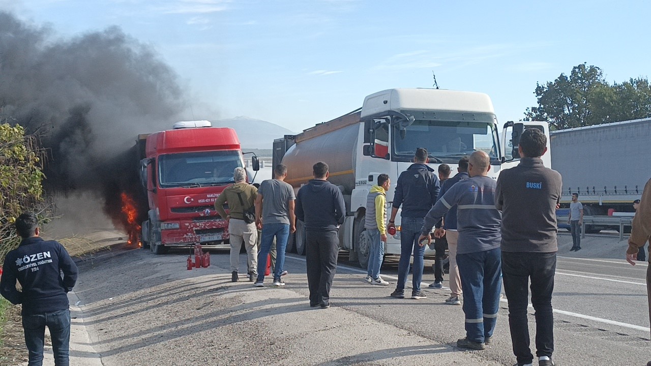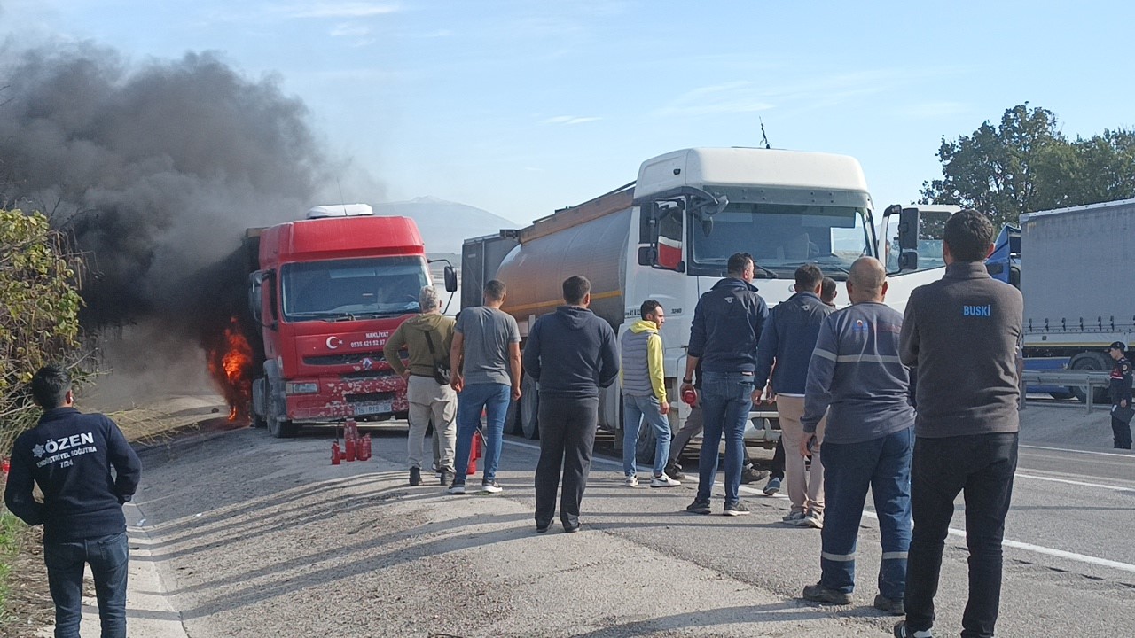Bursa-İzmir Karayolu üzerinde bir kamyon seyir halindeyken alev alev yandı. Yangını gören herkes aracından yangın tüpünü kapıp müdahale etmeye çalıştı. Tüplerin yarısından fazlasının boş çıkması herkesi şok ederken, kamyonun lastiklerinde başlayan yangın kısa sürede 400 litrelik benzin deposuna ulaşınca paniğe sebep oldu. Yangını söndürmeye yoldan geçen bir su tankerinin müdahalesi de yeterli olmadı. İtfaiye ekipleri benzin deposu patlamadan alevleri söndürmeyi başardı.