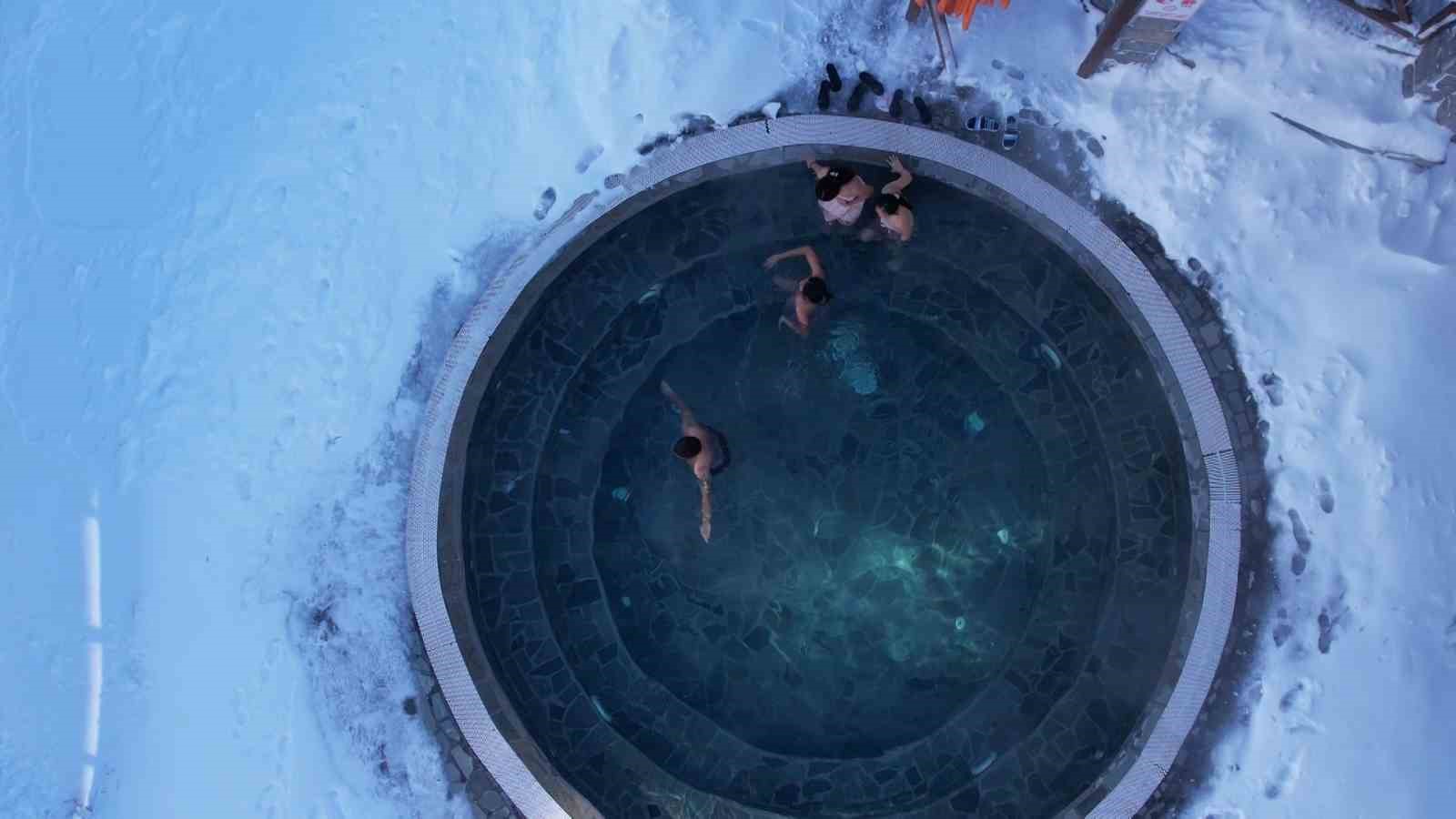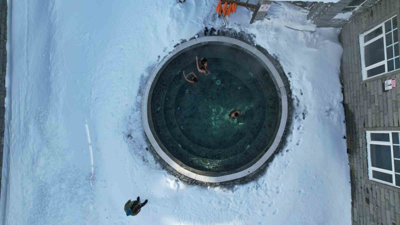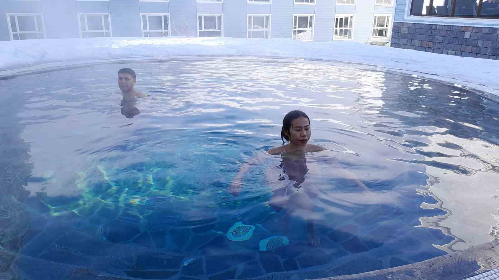 Uludağ’da turistler, eksi derecede karda yürüyüp, açık havadaki sıcak havuza giriyor. Kayak yaparken hamam sefası yapmanın keyfini yaşayan turistler, dondurucu soğuğa rağmen peştamalla dışarıda geziyor.