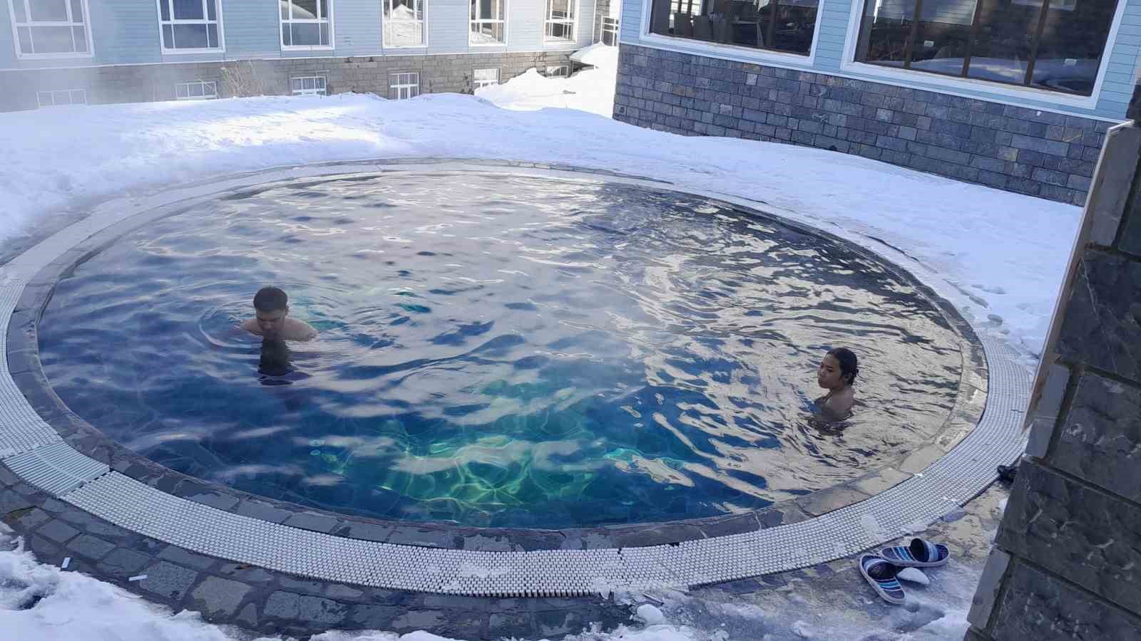 Uludağ’da kayak yaparak üşüyen turistler, 37 derecelik açık havuzda yorgunluk ve stres atıyor.