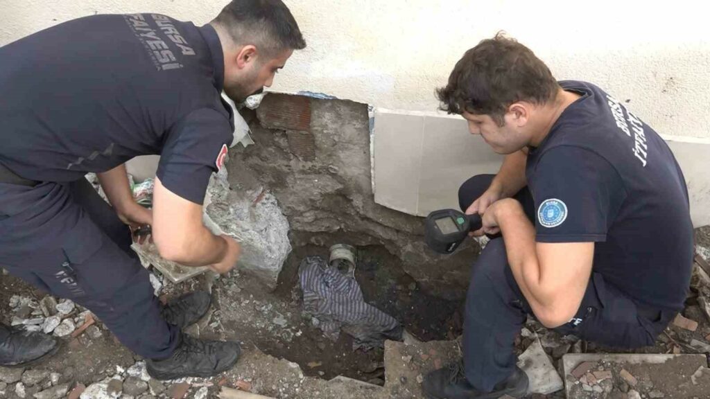 Merkez Osmangazi ilçesi Hüdavendigar Mahallesi 4. Armut sokaktan geçenler, derinden kedi sesinin geldiğini fark etti. 4 katlı Binanı çatısındaki gider borusundan aşağı düşen kedi, borunun içerisinde sıkıştı. Ev sahipleri tarafından giderin üstü açılırken, kediyi kurtarmak için santim santim kazdılar. Kedinin kendisi çıkması için borunun ucuna salam koyulurken, tepki vermesi ve kendi çıkması için aralıklarla kedi sesi dinletildi. Olay yerine gelen Bursa Büyükşehir Belediyesi İtfaiye Daire Başkanlığı Arama Kurtarma ekipleri de, termal kamera ve sistemleriyle kedinin nerede olduğunu tespit etti.