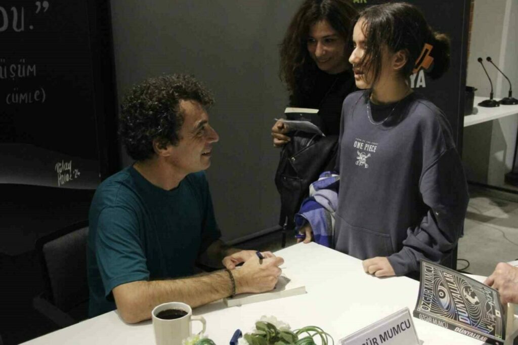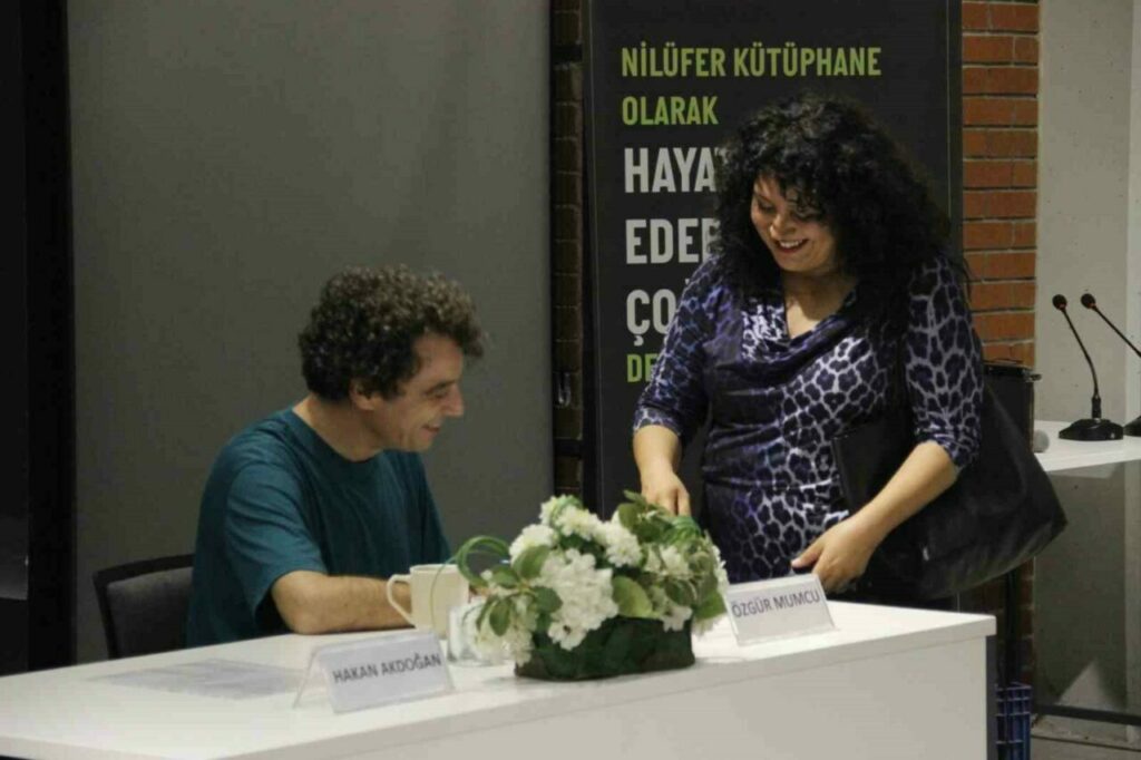 Söyleşinin sonunda katılımcıların sorularını da yanıtlayan Özgür Mumcu’ya, Nilüfer Belediye Başkanı Şadi Özdemir’in eşi Nuray Özdemir günün anısına hediye verdi. Mumcu, etkinliğin sonunda son romanı “Dünyalılar”ı okurları için imzaladı.