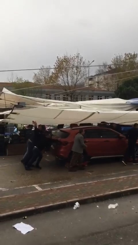 Olay, merkez Yıldırım İlçesi Cumalıkızık Mahallesinde meydana geldi. İddiaya göre otomobilini geceden pazar alanına park eden sürücü bir süre sonra ortalıktan kayboldu. Sabah tezgahlarını açmak isteyen pazarcılar, otomobil sahibine ulaşmak istese başarılı olamadı. Kendi dertlerine derman olan pazarcılar, otomobilin altına palet koyup aracı sürüklemeyi başardılar. O anlar bazı vatandaşların kamerasına anbean yansıdı.