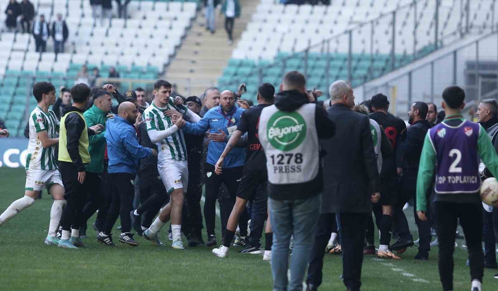 Profesyonel Futbol Disiplin Kurulu, Diyarbekirspor maçı sonrası Bursaspor’a ağır cezalar verdi. TFF’den yapılan açıklama şöyle: “Bursaspor Kulübü’nün, 20.12.2023 tarihinde oynanan Bursaspor-Diyarbekirspor TFF 2. Lig Beyaz Grup müsabakasında, taraftarlarının neden olduğu çirkin ve kötü tezahürat nedeniyle ve bu eylemin aynı sezon içinde ev sahibi kulüp olduğu müsabakada 2. kez gerçekleştirilmesinden dolayı 16 bin TL para cezası ile cezalandırılmasına, aynı müsabakada Bursaspor Kulübü’nün, taraftarlarının ve mensuplarının neden olduğu saha olayları nedeniyle 2 resmi müsabakayı kendi sahasında seyircisiz oynama ve 56 bin TL para cezası ile cezalandırılmasına, aynı müsabakada Bursaspor Kulübü’nün, statüye aykırılık nedeniyle ihtar cezası ile cezalandırılmasına, aynı müsabakada Bursaspor Kulübü’nün, takım halinde sportmenliğe aykırı hareketi nedeniyle 6 bin 750 TL para cezası ile cezalandırılmasına, aynı müsabakada Bursaspor Kulübü sporcusu Ozan İsmail Koç’un, rakip takım mensubuna yönelik sportmenliğe aykırı hareketi nedeniyle 2 resmi müsabakadan men ve 18 bin TL para cezası ile cezalandırılmasına, aynı müsabakada Bursaspor Kulübü sporcusu Bilal Güney’in, rakip takım mensubuna yönelik sportmenliğe aykırı hareketi nedeniyle 2 resmi müsabakadan men ve 18 bin TL para cezası ile cezalandırılmasına, aynı müsabakada Bursaspor Kulübü sporcusu Çağatay Yılmaz’ın, rakip takım mensubuna yönelik saldırısı nedeniyle, çift sarı kart görmesinden dolayı yer almaması gereken müsabaka dışında ayrıca 6 resmi müsabakadan men ve 10 bin 800 TL para cezası ile cezalandırılmasına, aynı müsabakada Bursaspor Kulübü sporcusu Canberk Yurdakul’un, rakip takım mensubuna yönelik saldırısı nedeniyle 5 resmi müsabakadan men ve 9 bin TL para cezası ile cezalandırılmasına, aynı müsabakada Bursaspor Kulübü sporcusu Eren Tunalı’nın, rakip takım mensubuna yönelik saldırısı nedeniyle 5 resmi müsabakadan men ve 9 bin TL para cezası ile cezalandırılmasına, aynı müsabakada Bursaspor Kulübü sporcusu Talha Yakın’ın, rakip takım mensubuna yönelik saldırısı nedeniyle 5 resmi müsabakadan men ve 9 bin TL para cezası ile cezalandırılmasına, aynı müsabakada Bursaspor Kulübü sporcusu Ertuğrul Kurtuluş’un, rakip takım mensubuna yönelik sportmenliğe aykırı hareketi nedeniyle 1 resmi müsabakadan men ve 9 bin TL para cezası ile cezalandırılmasına, aynı müsabakada Bursaspor Kulübü sporcusu Mustafa Genç hakkında, FDT’nin 85/4. ve 44. maddeleri uyarınca 23.12.2023 tarihinden itibaren idari tedbir konularak savunmasının istenmesine karar verilmiştir.”