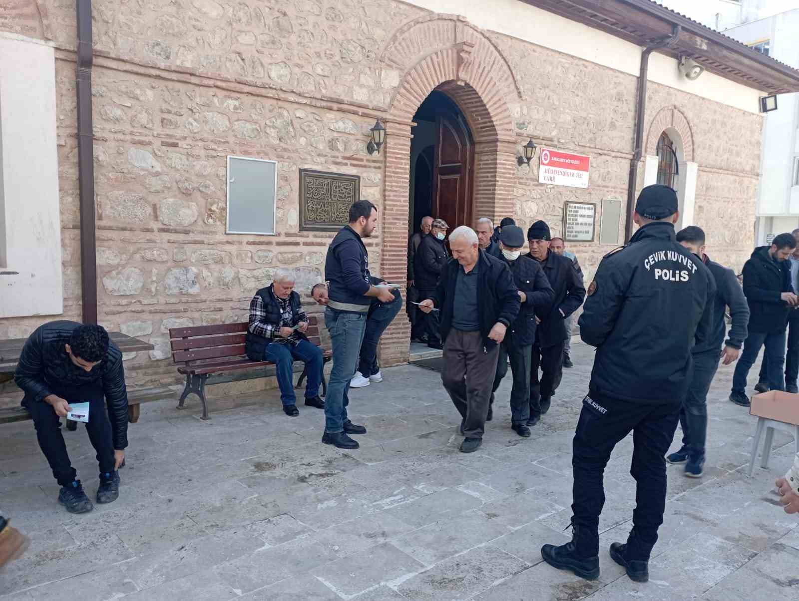 Karacabey İlçe Emniyet Müdürlüğü ekipleri tarafından Cuma namazı sonrası camiden çıkan vatandaşlara hırsızlık ve dolandırıcılık olaylarına karşı alınması gereken tedbirleri anlatan broşürler dağıtıldı.