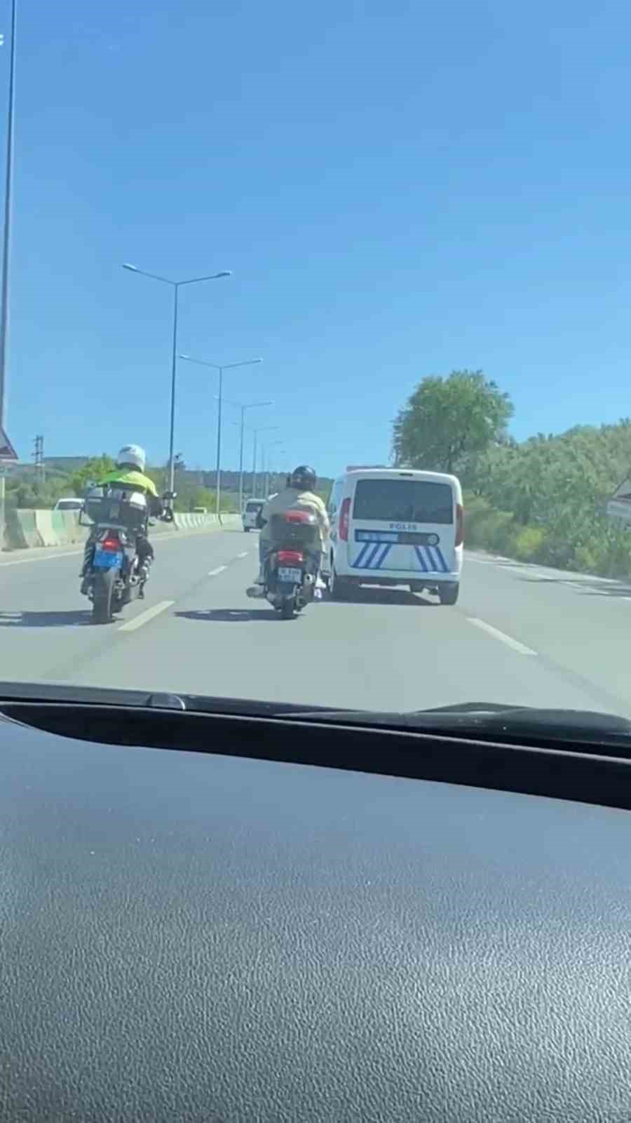 Edinilen bilgiye göre, dün Mudanya ilçesinde polis ekipleri, Emirhan Y. idaresindeki 16 AVK 953 plakalı motosikletten şüphelenerek ‘Dur’ ihtarında bulundu. ‘Dur’ ihtarına uymayan 16 AVK 953 plakalı motosiklet sürücüsü Emirhan Y., ekipleri peşine takarak kaçmaya başladı. Bursa-Mudanya yolu üzerinde film sahnelerini aratmayan kovalamaca, polis ekiplerinin kazaya sebebiyet vermemek için motosikletin peşini bırakmaları ile son buldu. Dün akşam saatlerinde Mudanya İlçe Emniyet Müdürlüğü’ne bağlı ekipler, Emirhan Y.’yi yakalayarak hakkında adli işlem başlattı. Emirhan Y.’ye ‘kasksız motosiklet kullanmak’, ‘ters yönde ilerlemek’, ‘kırmızı ışık ihlali’ ve ‘yetersiz ehliyet’ten 24 bin lira idari para cezası kesildi.