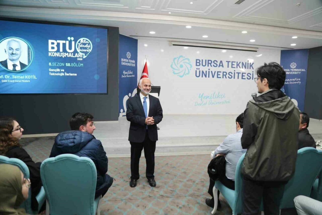 Bursa Teknik Üniversitesi (BTÜ) tarafından her hafta çarşamba günü düzenlenen BTÜ Konuşmaları’nın 6’ncı sezon 58’nci bölüm konuğu, Türk havacılık ve savunma sanayiinin gelişiminde önemli katkıları bulunan Prof. Dr. Temel Kotil oldu. Mimar Sinan Yerleşkesi Turkuaz Salon’da gerçekleşen programa; BTÜ Rektörü Prof. Dr. Naci Çağlar, Rektör Yardımcıları Prof. Dr. Beyhan Bayhan, Prof. Dr. Sinan Uyanık ve Prof. Dr. Barış Tamer Tonguç, akademisyenler ile öğrenciler katıldı. “Gençlik ve Teknolojik İlerleme” başlıklı konuşmasında Prof. Dr. Temel Kotil, mühendislikten yapay zekâya, küresel rekabetten organizasyonel dönüşüme kadar değerlendirmelerde bulundu. Prof. Dr. Kotil, günümüz dünyasında bilgiye erişimin geçmişe kıyasla çok daha kolay olduğunu belirterek, asıl farkın bu bilgiyi doğru analiz edebilmek ve üretime dönüştürebilmek olduğunu vurguladı.