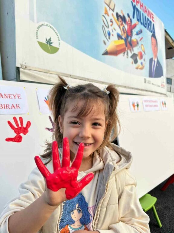 Osmangazi Belediyesi’nin merkeze uzak mahallerdeki çocukları kitap ile buluşturmak ve onlara okuma alışkanlığı kazandırmak amacıyla hayata geçirdiği Gezici Kütüphane’ye gelen küçük öğrenciler, rengarenk boyadıkları elleri ile hatıra panosu oluşturdu.