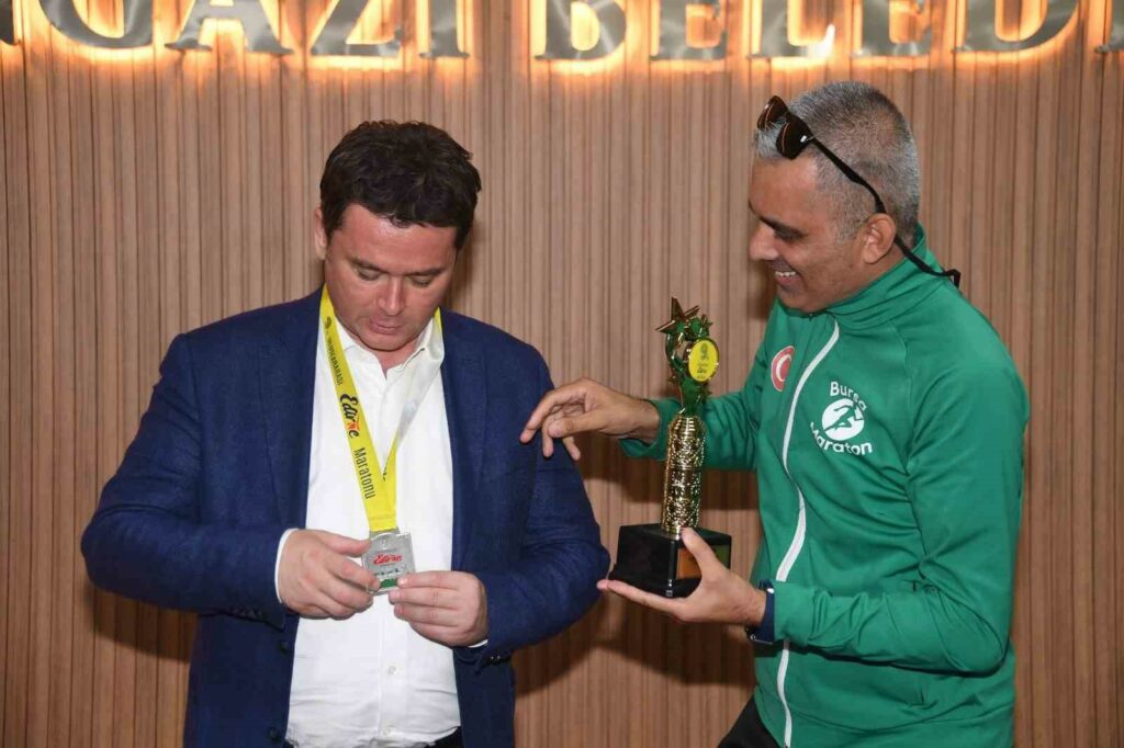 Osmangazi Belediyesi Koşu Takımı, bu yıl 9’uncusu düzenlenen Uluslararası Edirne Yarı Maratonu’nda kazanılan birincilik kupası ile Osmangazi Belediye Başkanı Erkan Aydın’ı ziyaret etti.
