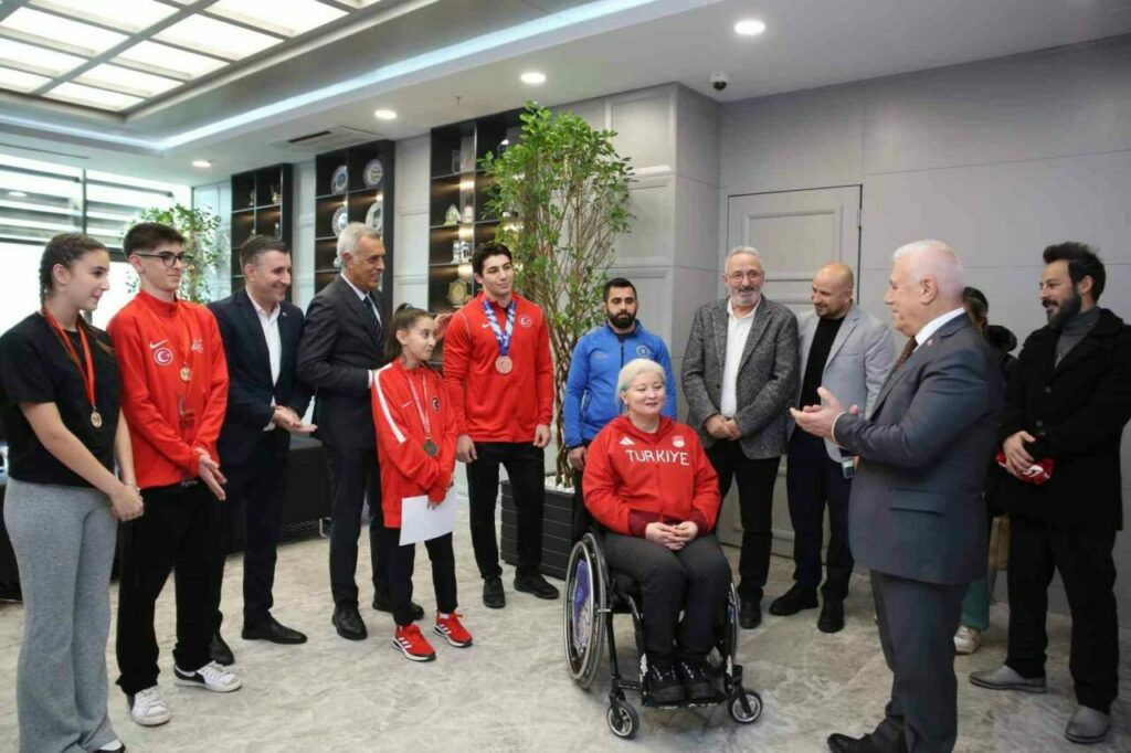 Bursa Büyükşehir Belediye Başkanı Mustafa Bozbey, Bursa Büyükşehir Belediyespor’un milli sporcuları Aysel Özgan ve Ahmet Yağan ile Bursalı milli sporcular Elif Mutlu, Ali Efe Aydın ve Beren Aydın’ı makamında ağırladı.