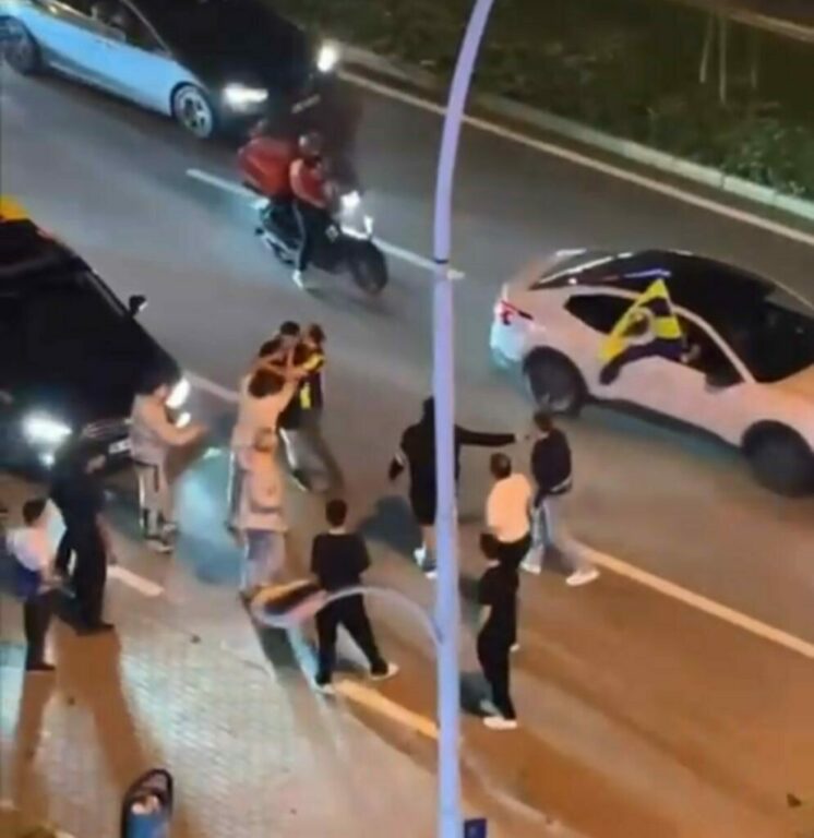 Bursa’da Fenerbahçe’nin şampiyonluk kutlamaları sırasında iki grup arasında çıkan kavgada bir kişi yerde tekmelerin hedefi oldu. Çevredekilerin güçlükle ayırdığı kavga anı kameraya yansıdı.