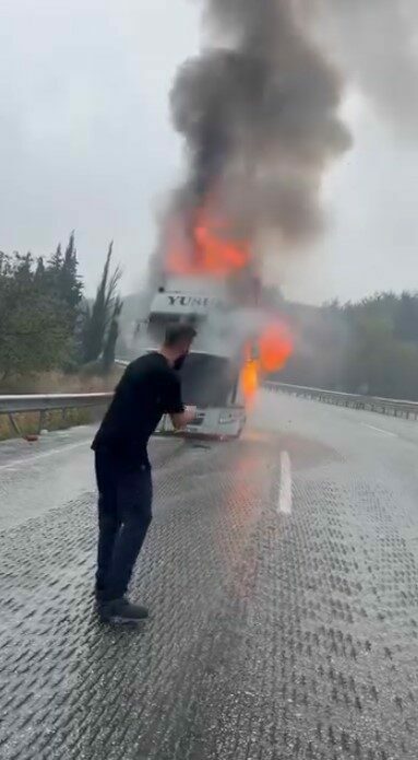 Edinilen bilgiye göre, olay bugün saat 13.15 sıralarında Bursa – Yalova yolu Dürdane yokuşunda meydana geldi. Bursa’dan Yalova yönüne gitmekte olan tırın motor bölümünde henüz bilinmeyen bir nedenle yangın çıktı. Durumu fark eden sürücü aracı kenara çekti ve ilk olarak alevlere kendi imkanları ile müdahale etmek istedi. Yangının büyümesi üzerine olay yerine itfaiye ekipleri sevk edildi. Tırın motor bölümünde çıkan yangın kısa sürede büyüyünce alevler ön kısmını sardı. Yangın itfaiye ekipleri tarafından söndürülürken, alevlere teslim olan tırın bir kısmı yanarak kullanılamaz hale geldi.