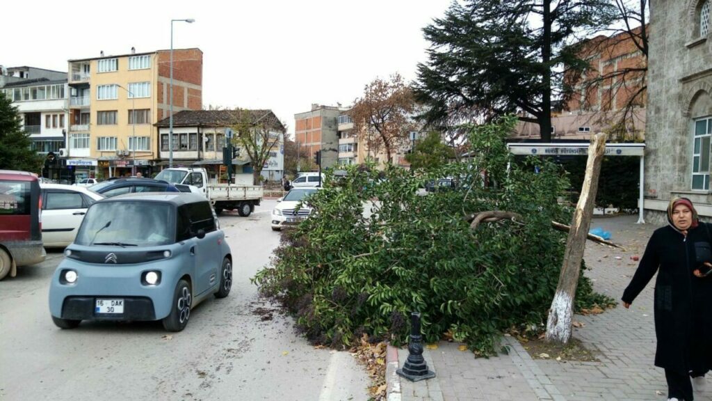 Olay, saat 12.00 sıralarında Sinanbey Mahallesi Yenişehir caddesinde meydana geldi. Şiddetli lodosa dayanamayan ağaçta ortadan ikiye ayrılarak devrildi. Olay yerine gelen belediye ekipleri ağacı yoldan kaldırdı.
