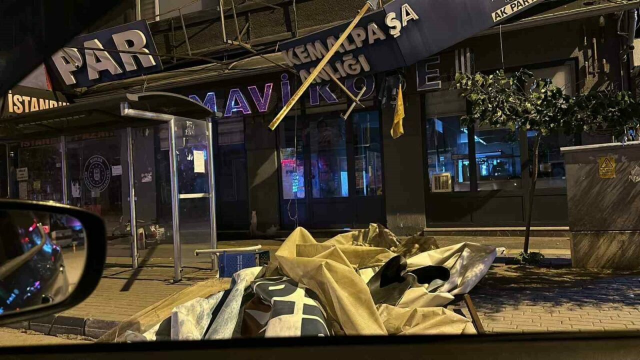 Bursa’nın Mustafakemalpaşa ilçesinde gece yarısı etkili olan şiddetli fırtına, ilçede hayatı olumsuz etkiledi. Fırtına nedeniyle AK Parti İlçe Başkanlığı binasının tabelası yola savruldu.