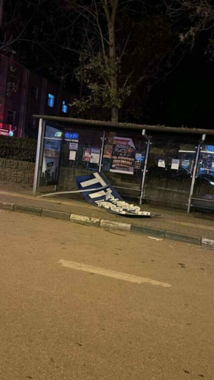 Bursa’nın Mustafakemalpaşa ilçesinde gece yarısı etkili olan şiddetli fırtına, ilçede hayatı olumsuz etkiledi. Fırtına nedeniyle AK Parti İlçe Başkanlığı binasının tabelası yola savruldu.