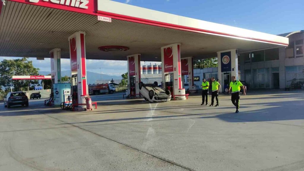 Bursa’nın Orhangazi ilçesinde ana yol üzerinde kontrolden çıkan otomobil, takla atarak akaryakıt istasyonuna daldı. Ters şekilde metrelerce sürüklenen otomobilin sürücüsü yaralanırken, aracın akaryakıt pompalarının yanında durması ile faciadan dönüldü.