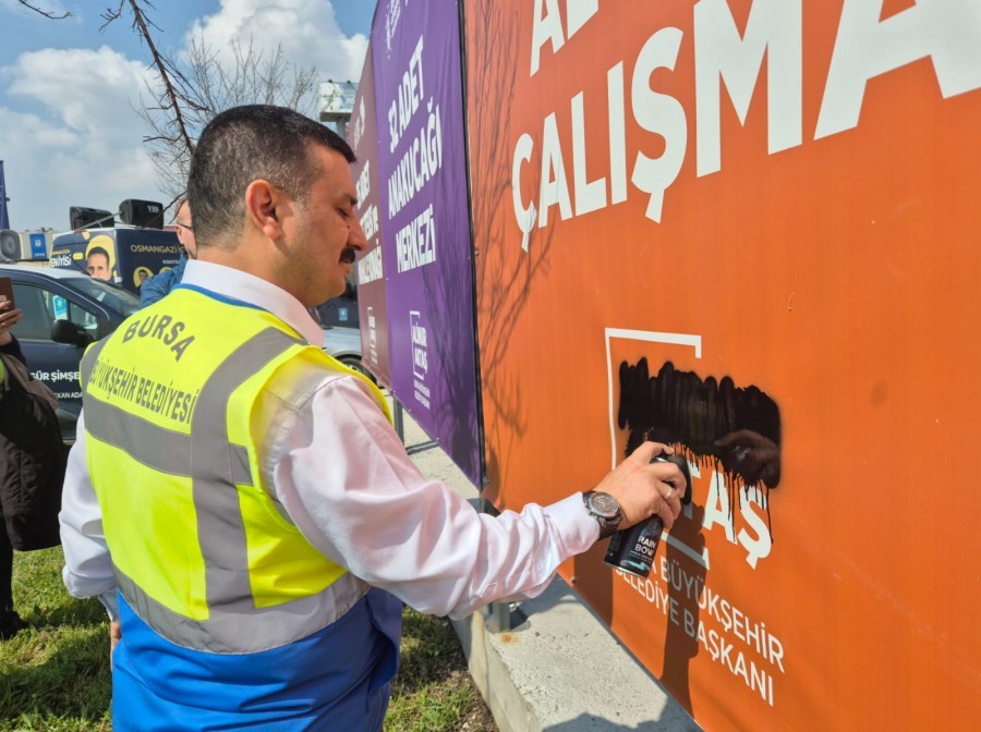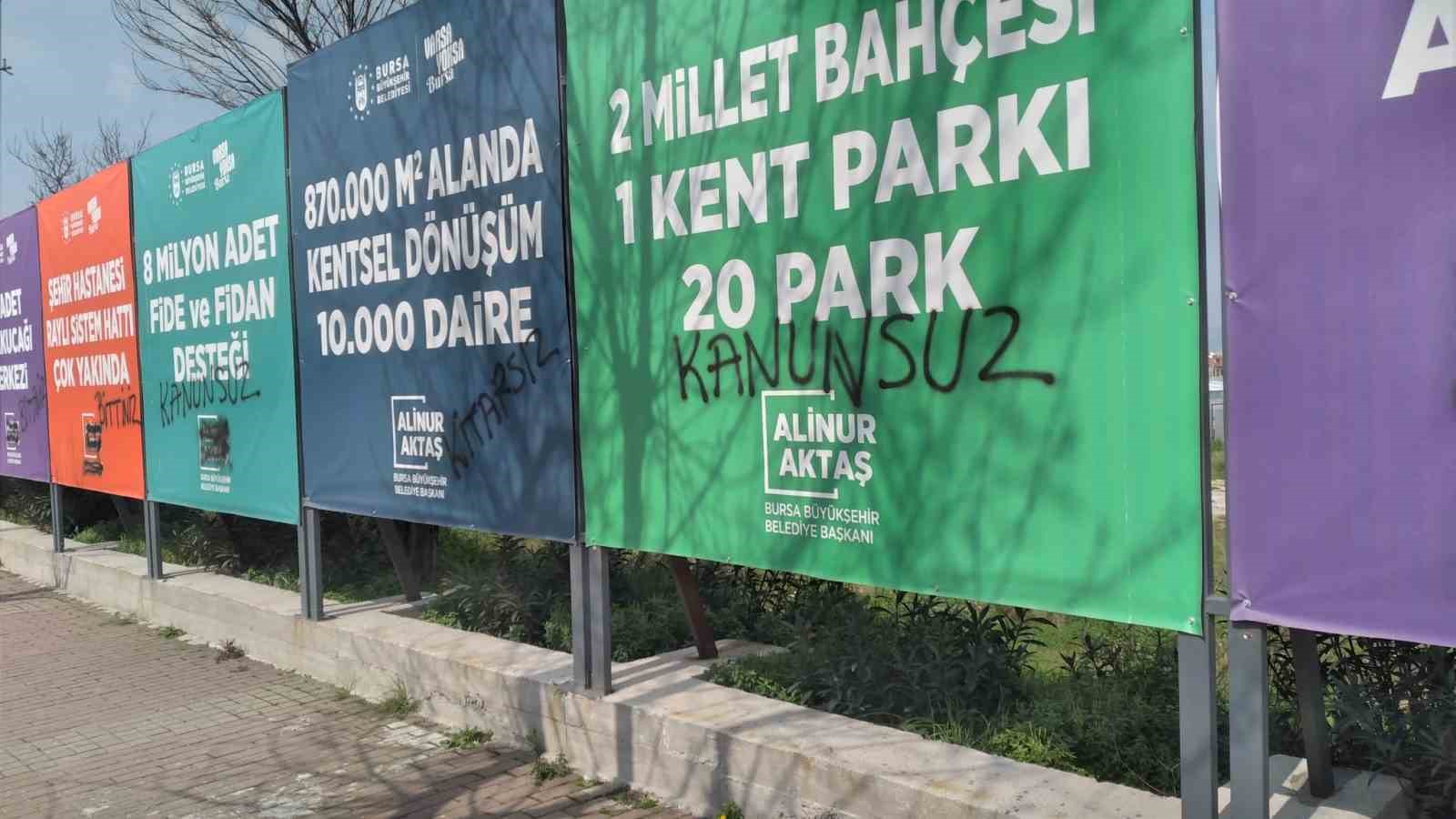 Yerel seçim sürecinde Cumhurbaşkanı Recep Tayyip Erdoğan tarafından yeniden aday gösterilen Bursa Büyükşehir Belediye Başkanı Alinur Aktaş’ın 6 yıllık süreçte Bursa’da hayata geçirdiği hizmetleri ve projelerini içeren tanıtım tabelalarına İYİ Parti Büyükşehir Belediye Başkan adayı Selçuk Türkoğlu ve beraberindeki partililer tarafından 17 Mart 2024 Pazar günü sprey boya ile karalayarak provake edici sözler yazıldı. Gaziakdemir-Sıcaksu Kentsel Dönüşüm alanında bulunan, siyasi parti adı ve logosu bulunmayan, adaylıkla ilgili ifadelerin de yer almadığı tanıtım tabelalarının önünde basın açıklaması gerçekleştiren İYİ Parti Büyükşehir Belediye Başkan adayı Selçuk Türkoğlu ve beraberindeki partililer, tanıtım tabelalarının afişlerini yırtarken üzerlerine de “Kanunsuz, yasak ve kanma” gibi sözler yazdı.