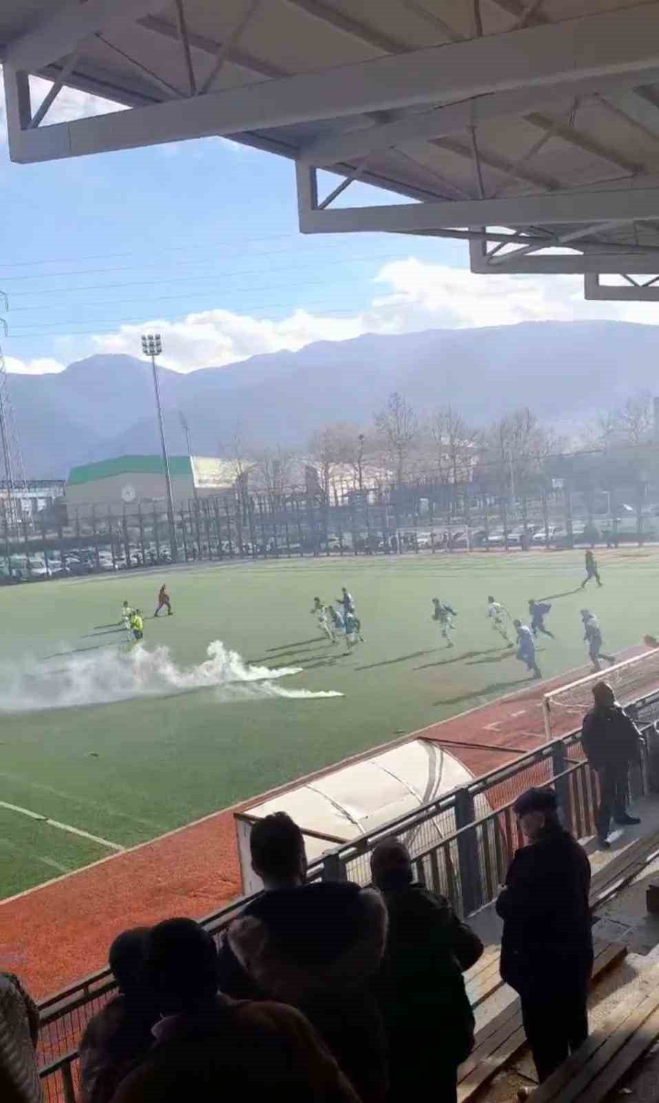 Bursa’da geçtiğimiz gün Osmangazi ilçesine bağlı Atıcılar Sahası’nda oynanan İnegöl Orhaniye Spor – İznik Spor maçı için gelen taraftar saha etrafında toplanmaya başladı. İnegöl Sporlu bir grup holigan, maç öncesi oynanan Namık Kemal Spor ile Emek Spor maçını izlemek istedi. Tribünde rakip takımdan gelen taraftarların olduğunu zanneden holiganlar bir anda kavgaya tutuşup hem sahaya, hem de tribünlere torpil ve meşale attı.