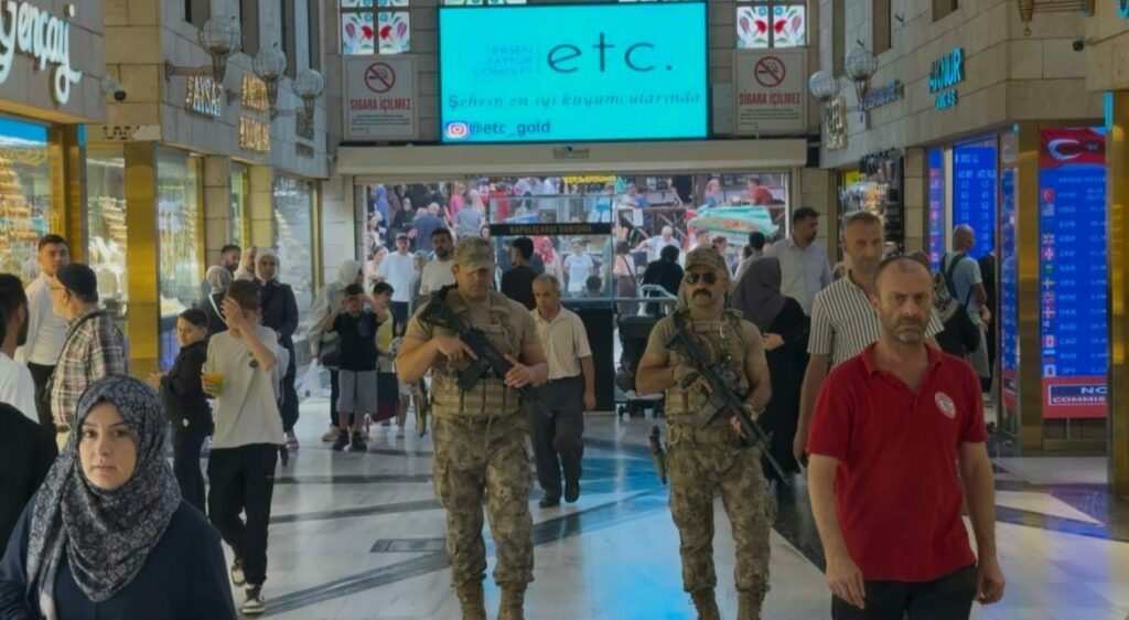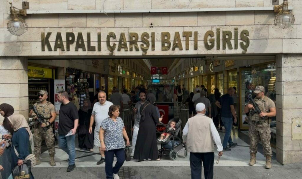 Çelik yelekli, otomatik silahlı özel harekat timleri Kapalıçarşı’nın giriş çıkışlarında ve kalabalık noktalarda sürekli devriye geziyor. Güvenliğin en üst seviyeye çıktığı Kapalıçarşı’da, tarihi dokuya eşlik eden özel harekat manzarası ziyaretçilerin ve turistlerin dikkatini çekiyor, cep telefonlarıyla da kaydediliyor.
