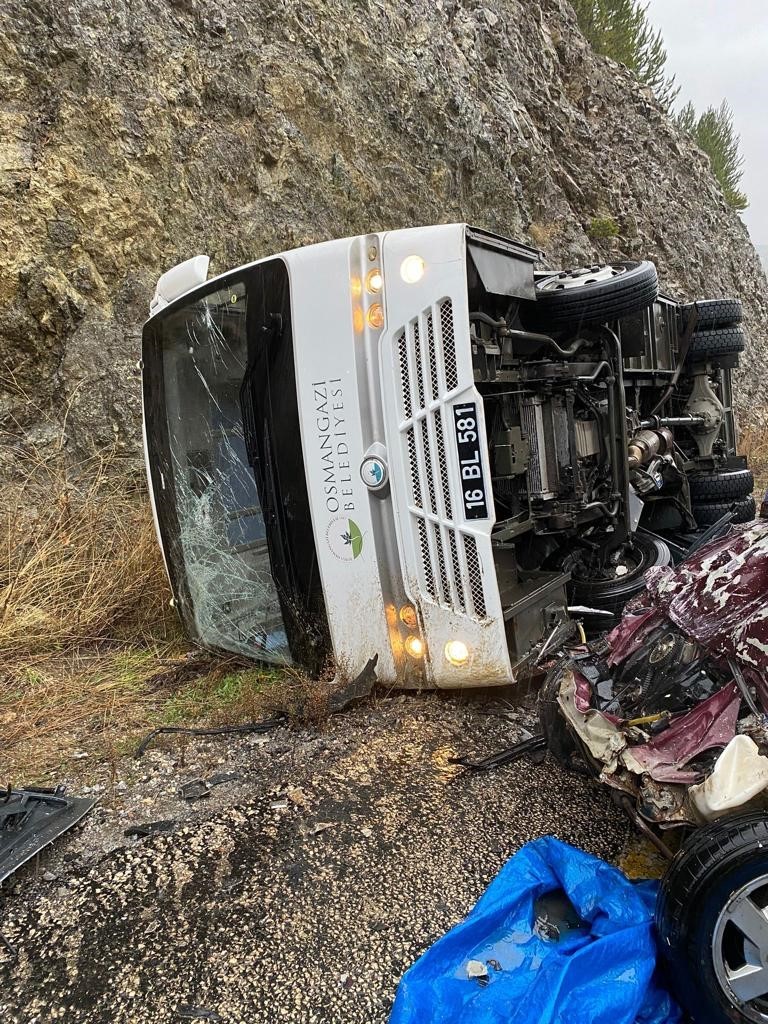 Bursa’da taziye yakınlarını taşıyan otobüs ile otomobil çarpıştı. Kazada 1 kişi hayatını kaybederken, 3 kişi de yaralandı.