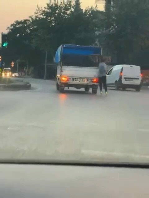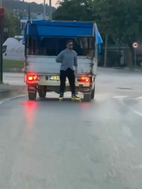 Olay, merkez Nilüfer ilçesinde meydana geldi. Patenle seyahat eden bir genç, önünde seyir halinde olan kamyonetin arkasına tutunarak ilerlemeye başladı. Tehlikeli anlar saniye saniye amatör kameraya yansırken, genç ise ışıkta bekleyen kamyonetin ilerlemesini de bekledi. Yeşil ışıkta ilerleyen kamyonete tekrar tutunarak seyahat eden gencin tehlikeli anları, amatör kameraya yansıdı.