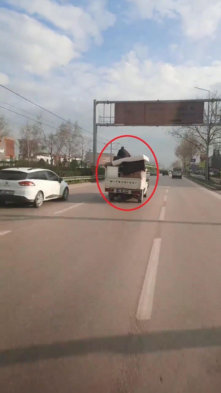 Merkez Osmangazi ilçesi Yeni Karaman Mudanya Caddesi üzerinde açık kasa kamyonet fazla yük yükledi. Yüklerin üzerinde bir kişinin kilometrelerce seyahat ettiğini gören diğer şoförler, korna ile ikaz etse de netice alamadı. Canını hiçe sayarak seyahat eden vatandaş, diğer sürücüler tarafından cep telefonu kamerasıyla kayda alındı.