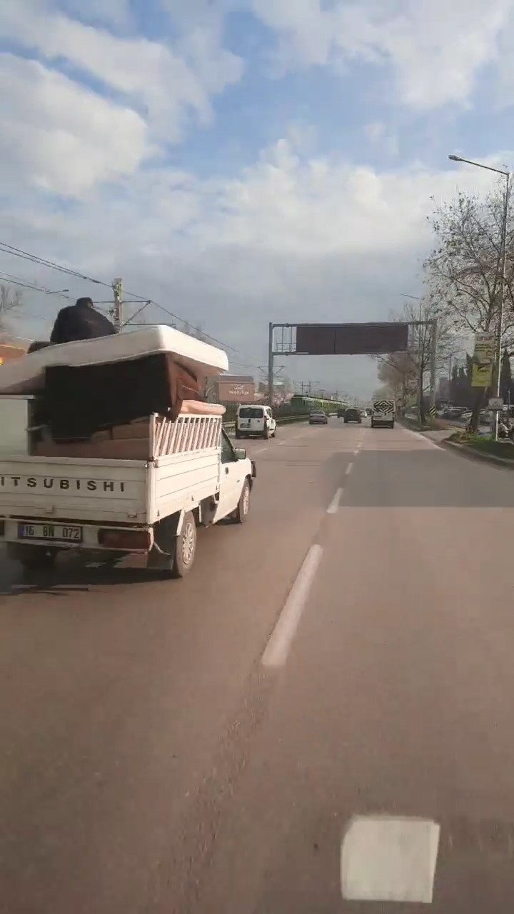 Bursa’da bir kişi açık kasa kamyonetin arkasındaki yüklerin üzerinde kilometrelerce yol gitti. O anlar kameraya yansıdı.
