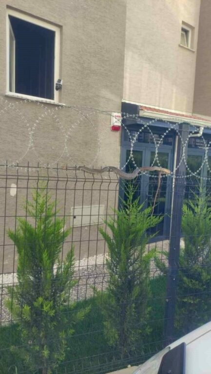 Nilüfer ilçesi Kurtuluş Mahallesindeki bir sitenin bahçe tellerine sarılı halde görülen yılan korku dolu anlar yaşattı. Zehirli olabileceği ihtimaline karşı kimsenin yaklaşamadığı yılanın nasıl oraya geldiği bilinmezken, itfaiye ekipleri yılanı bulunduğu yerden aldı. Jiletli teller sebebiyle ilerleyemeyen yılan, ekipler tarafından doğal ortamına salındı.