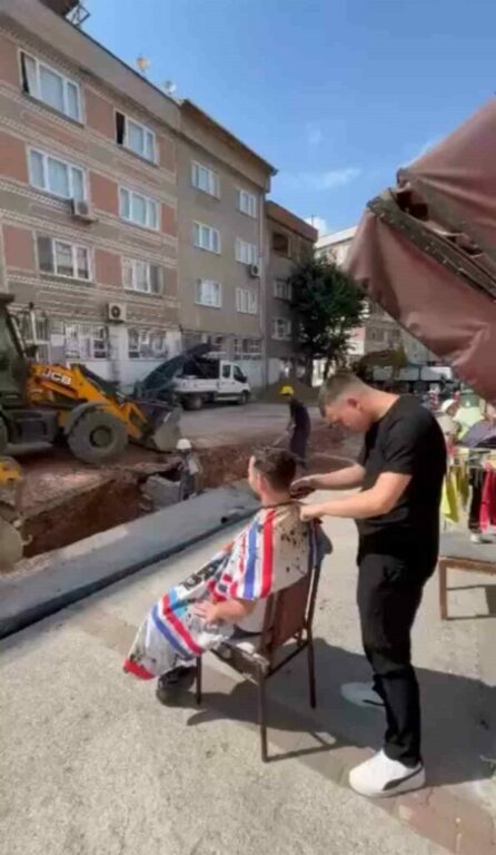 Osmangazi ilçesi Gülbahçe Mahallesi’nde tıraş olan bir vatandaş, yol yapım çalışması izlemek için koltuğu dışarıya çıkardı. Berberini de ikna eden vatandaş, kaldırım üzerinde hem tıraş oldu hem de yol yapım çalışmasını izledi. O ilginç anlar çevrede bulunan bir vatandaş tarafından kaydedildi.