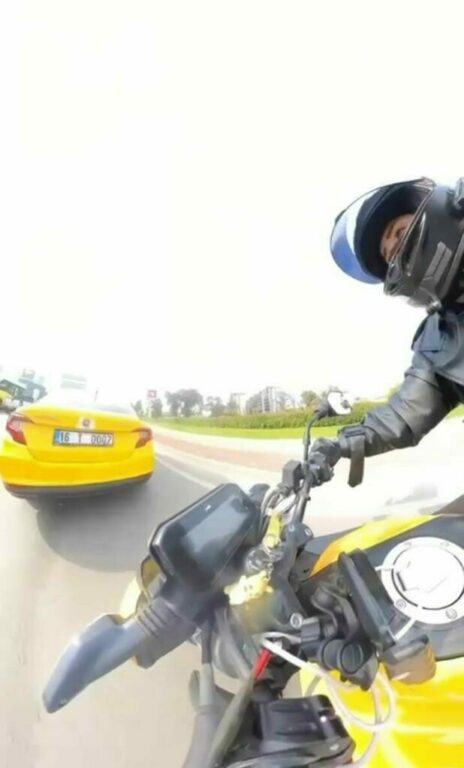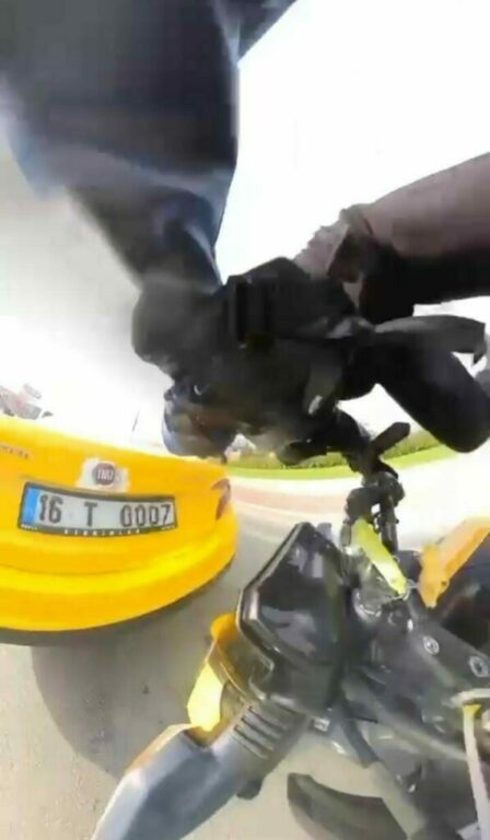 Bursa’da seyir halindeki motosiklet sürücüsü, önünde duran taksiyi görmeyip çarptı. O anlar motosiklet sürücüsünün aksiyon kamerasına yansıdı.