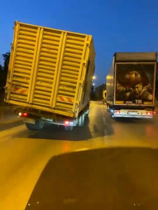 Vatandaşlar, bu tehlikeli durumu cep telefonlarıyla kaydederken, olay sosyal medyada da kısa sürede gündem oldu. Görüntülerde kamyonun sağa doğru ciddi bir şekilde yatmış olduğu ve sürücünün hiçbir önlem almadan yoluna devam ettiği görülüyor.