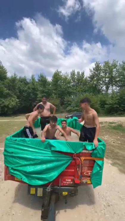 Bursa’nın İnegöl ilçesinde sıcaktan bunalan gençler, traktör römorkuna doldurdukları suyla serinledi.