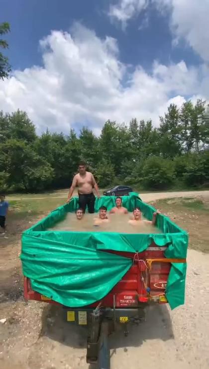 İnegöl’ün Gündüzlü Mahallesi’nde sıcaktan bunalan 7 genç, traktörün arkasında bağlanan römorka su doldurup serinlediler. Zaman zaman seyir halinde de serinleyen gençleri görenler şaşkınlık yaşadı.