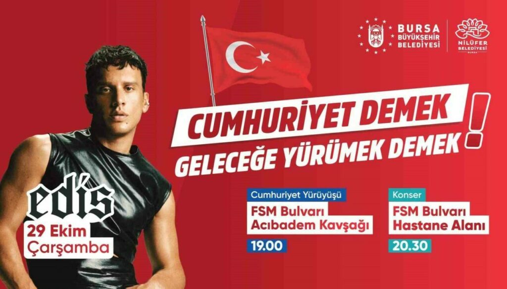 Bursa Büyükşehir Belediyesi ve Nilüfer Belediyesi tarafından 29 Ekim Çarşamba Günü düzenlenecek olan ‘Cumhuriyet Yürüyüşü’, on binlerce Bursalıyı Fatih Sultan Mehmet Bulvarı’nda buluşturuyor. Sevilen sanatçı Edis’in de sahne alacağı kutlamalarda, Cumhuriyet coşkusu doyasıya yaşanacak.