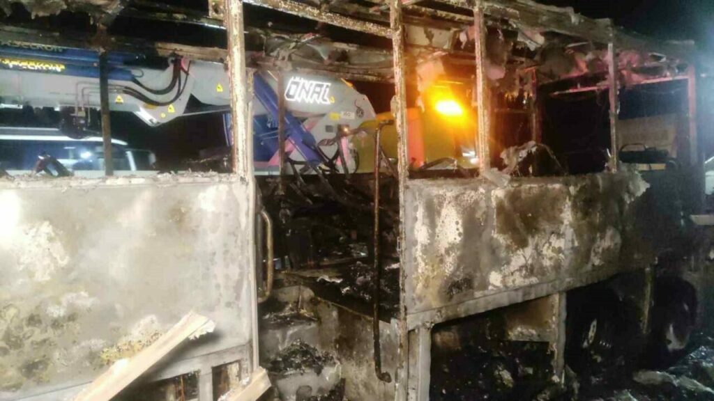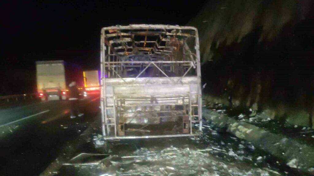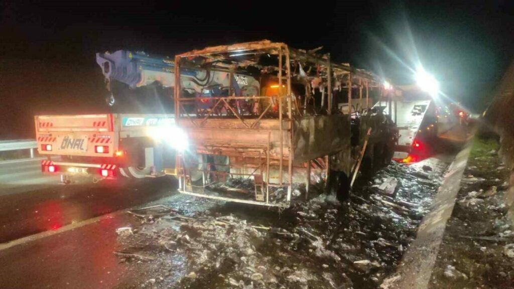 Bursa’da turistleri taşıyan otobüsün motorunda yangın çıktı. Sürücü aracı emniyet şeridine çekip 35 Suudi Arabistanlı turisti indirirken, alev topuna dönen otobüs kül oldu.