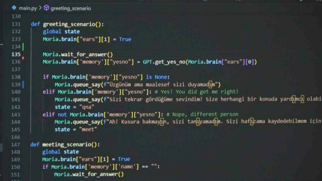 Moria’da birçok farklı mod olduğunu kaydeden Adar, etkileşime göre tepki verdiğini söyleyerek, “Robotumuz ’serbest mod’ dediğimiz bir modda çalışıyor. Bu moddayken etrafını inceliyor ve bir insan olup olmadığını kontrol ediyor. Eğer bir insanla karşılaşıyorsa ’sosyal mod’ açılıyor ve karşısındaki kişiye ’merhaba ben Moria’ diye kendini tanıtıp karşı taraftan cevap bekliyor. Karşı taraftan aldığı cevaba göre karşı tarafı tanıyıp tanımadığını kontrol ediyor. Daha önceden tanıdığı bir kişi ise ismi ile hitap ediyor. Eğer tanımadığı bir kişi ise bu durumda ’tanışma modu’ açılıyor. Bu modda kişinin ismini soruyor, bir adet fotoğraf çekip hafızaya kaydediyor. Bir sonraki soruya cevaplar üretiyor. Burada yapay zeka, görüntü işleme ve farklı algoritmalardan destek almış bulunmaktayız. Şu anki geliştirdiğimiz platformda robotumuz karşı tarafın sorusunu dinleyip sonra cevap oluşturuyor. Kendisi konuşurken siz devreye girerseniz konuştuğunuzu dinlemiyor. Bunun üzerine çalışmalarımızı sürdürüyoruz” dedi.