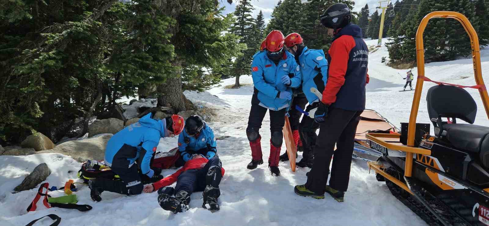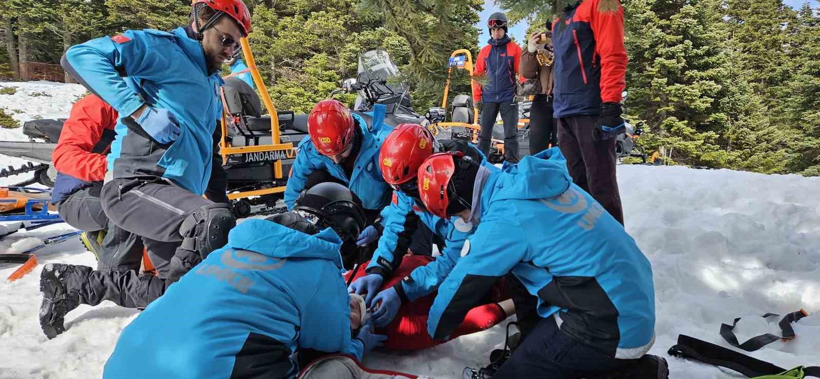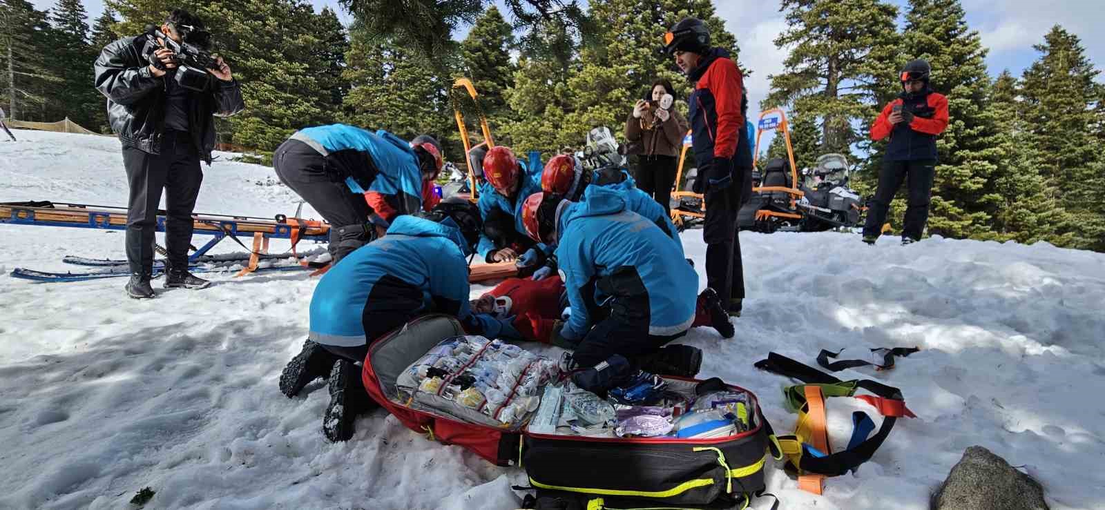 Tatbikat, haber merkezine gelen anons ile başladı. Anons sonrası ekipler harekete geçerek kar motorları ile yaralı vatandaşın yanına ulaştı. Nefes kesen tatbikatta ekipler, yaralıyı kurtarmak için zamanla yarıştı. Ulusal Medikal Kurtarma Ekibi (UMKE), Jandarma Arama Kurtarma (JAK), Afet ve Acil Durum Yönetimi Başkanlığı Ekibi (AFAD) ve Bursa İtfaiye Daire Başkanlığı olmak üzere 4 ekipten toplamda 66 kişinin katıldığı tatbikatta aldıkları eğitimi sahada uygulama imkânı bulan ekipler görevlerini başarılı bir şekilde tamamladı.