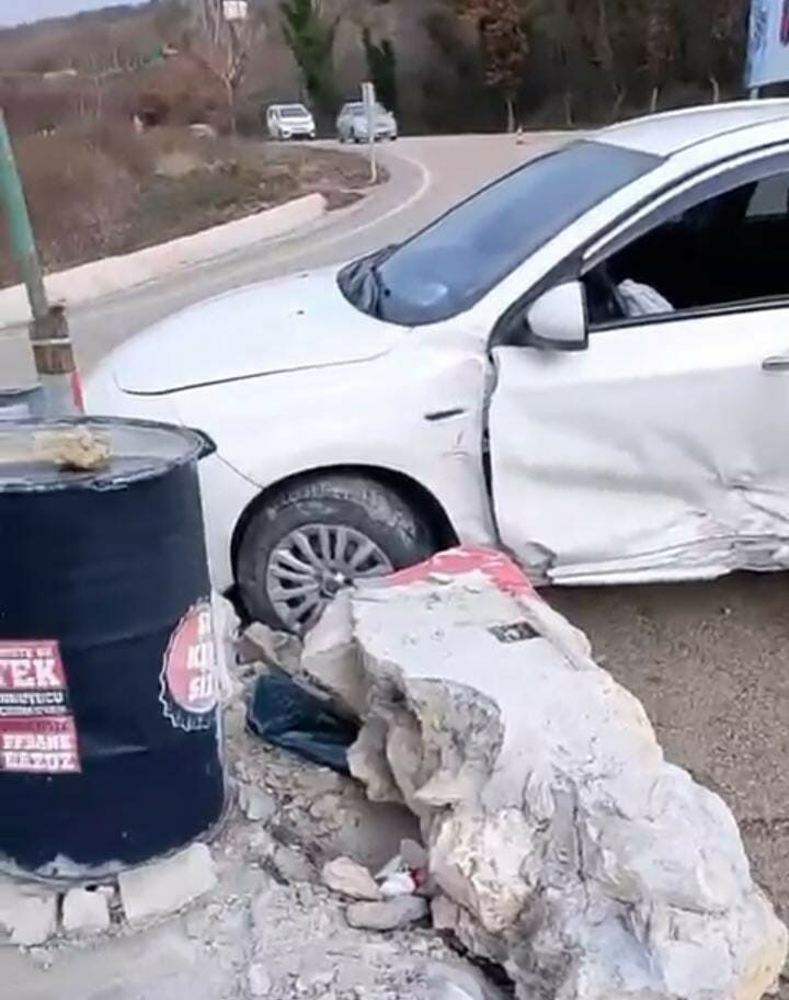 Uludağ yolundan şehir merkezine seyreden bir otomobil virajı alamayarak bariyerlere çarptı. O anlar güvenlik kamerasına yansıdı.