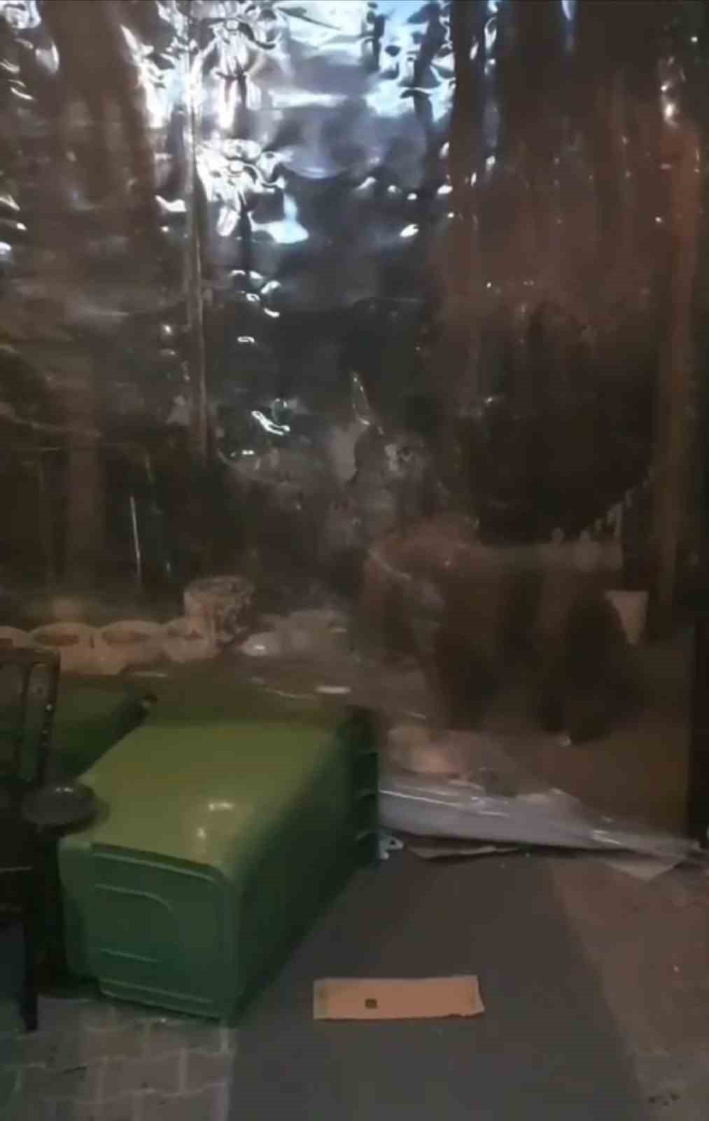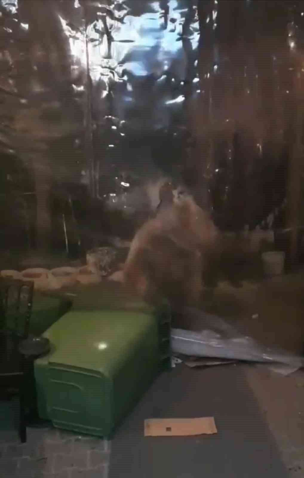 Uludağ’da kış uykusuna yatmayan ve aç kalan ayı ailesi bir işletmeye girmeye çalışırken, o anlar cep telefon kamerasına yansıdı.