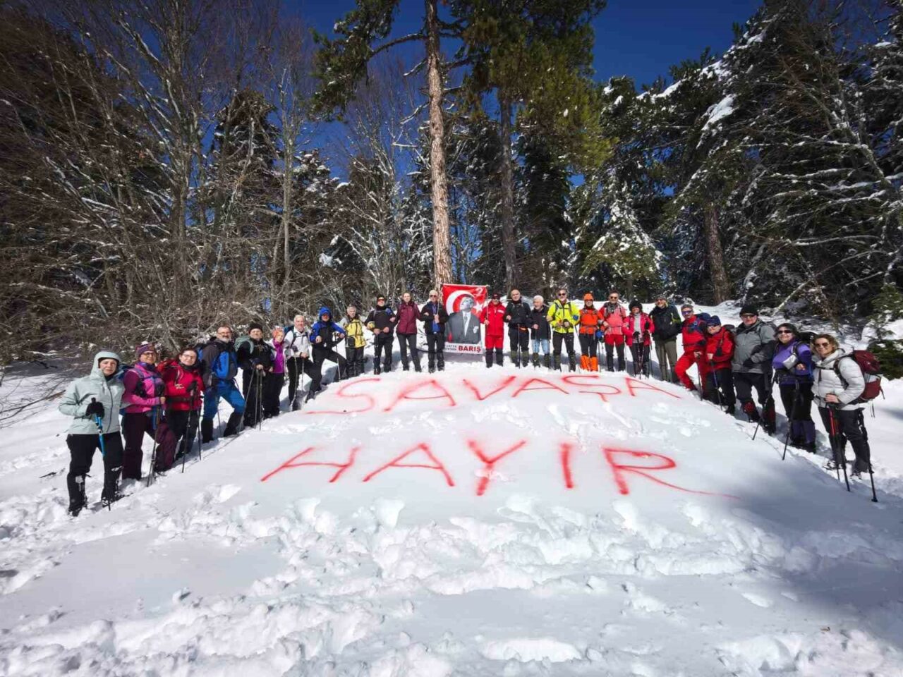 Kulüp üyeleri ve katılımcılar, dünyada yaşanan savaş ve çatışmalara dikkat çekmek amacıyla anlamlı bir mesaj verdi. Beyaz kar örtüsü üzerine büyük harflerle ’Savaşa hayır’ yazan doğaseverler, sporun barışçıl ve birleştirici gücünü bir kez daha ortaya koydu.