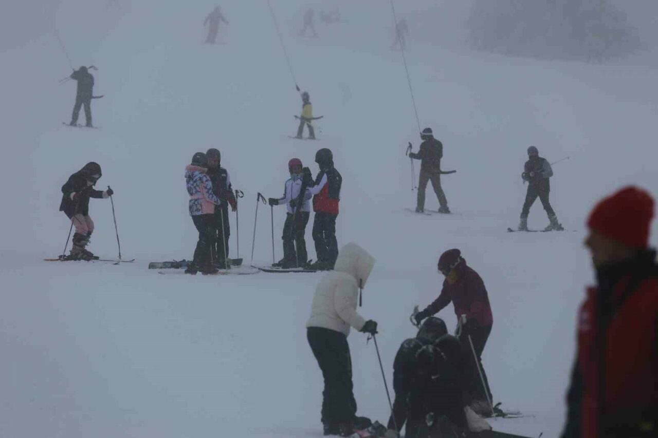 Türkiye’nin önemli kış turizmi merkezlerinden Uludağ’da sömestr tatilinin son günlerinde yoğunluk sürüyor. Tatilciler soğuk hava ve sise rağmen kayak ve snowboard sevdasınadn vazgeçmedi.