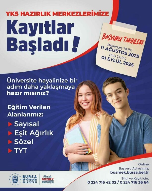 Bursa’da bugüne kadar binlerce genci ücretsiz YKS kursları ile üniversiteye hazırlayan Büyükşehir Belediyesi, 2025-2026 eğitim-öğretim yılı YKS hazırlık kursları için kayıtların başladığını duyurdu. Yeni dönem kayıtları başladı Bursa’da eğitime ve gençlere değer katan çalışmalarını her zaman ön planda tutan Büyükşehir Belediyesi, üniversite sınavlarına hazırlanan gençler için ücretsiz Yükseköğretim Kurumları Sınavı (YKS) hazırlık kursları düzenlemeye devam […]