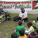 Bursa Teknik Üniversitesi öğrencilerinin, İsrail’in Filistin halkına yönelik aylardır düzenlediği saldırıları protesto etmek için kurdukları çadırlar, anaokulu öğrencileri tarafından ziyaret edildi.