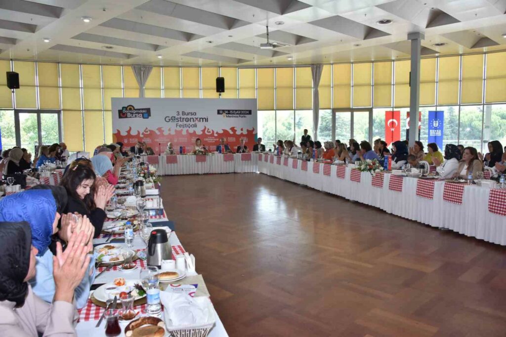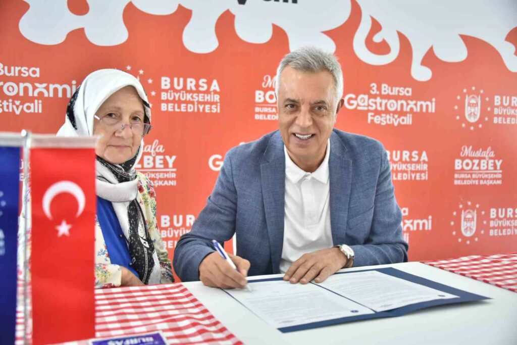 Bursa Büyükşehir Belediyesi tarafından 13-14-15 Eylül tarihlerinde Merinos Parkı’nda düzenlenecek olan 3. Bursa Gastronomi Festivali’nin heyecanı tüm kenti sardı. Bir yandan Gastronomi Tırı 17 ilçeyi gezerek Bursa’nın kendine özgü lezzetleri tanıtılırken, bir yandan da festivalin hazırlıkları tüm hızıyla sürüyor. Pek çok yeniliğin Bursalılarla buluşturacağı festivalde, üretim ve satış yapma kapasitesini elde etmiş kadın kuruluşlarını desteklemek amacıyla ‘Bursa üreten kadınlar sokağı’ da oluşturulacak. Festival öncesinde Bursa Büyükşehir Belediyesi ve 41 kadın kuruluşu arasında düzenlenen törenle sözleşme imzalandı. Merinos Atatürk Kongre Kültür Merkezi’ndeki programa, Bursa Büyükşehir Belediye Başkanı Mustafa Bozbey’in eşi Seden Bozbey, Büyükşehir Belediyesi Genel Sekreter Yardımcısı Mehmet Yıldız, Dış İlişkiler Dairesi Başkanı Pınar Işıkyıldız, Kültür AŞ Genel Müdürü Yankı İçöz, belediye bürokratları, kadın dernekleri ve kooperatiflerinin üyeleri katıldı.