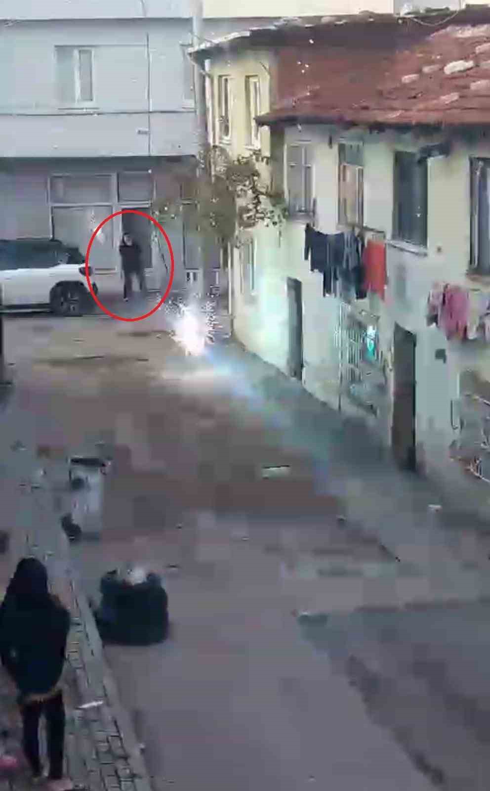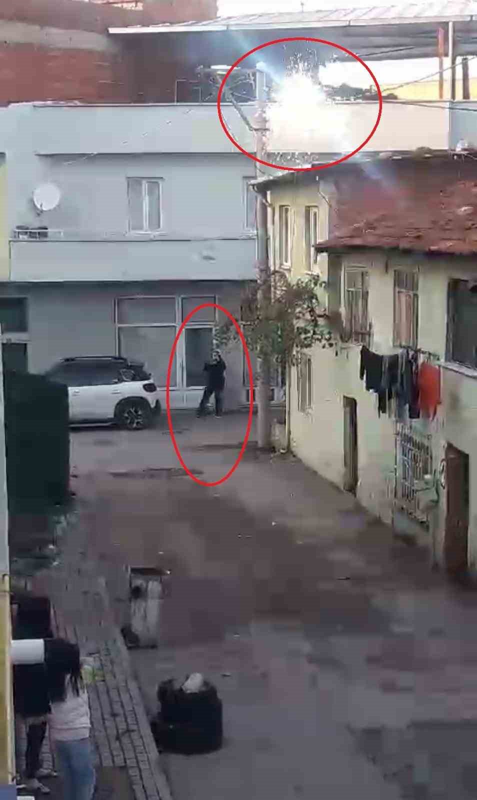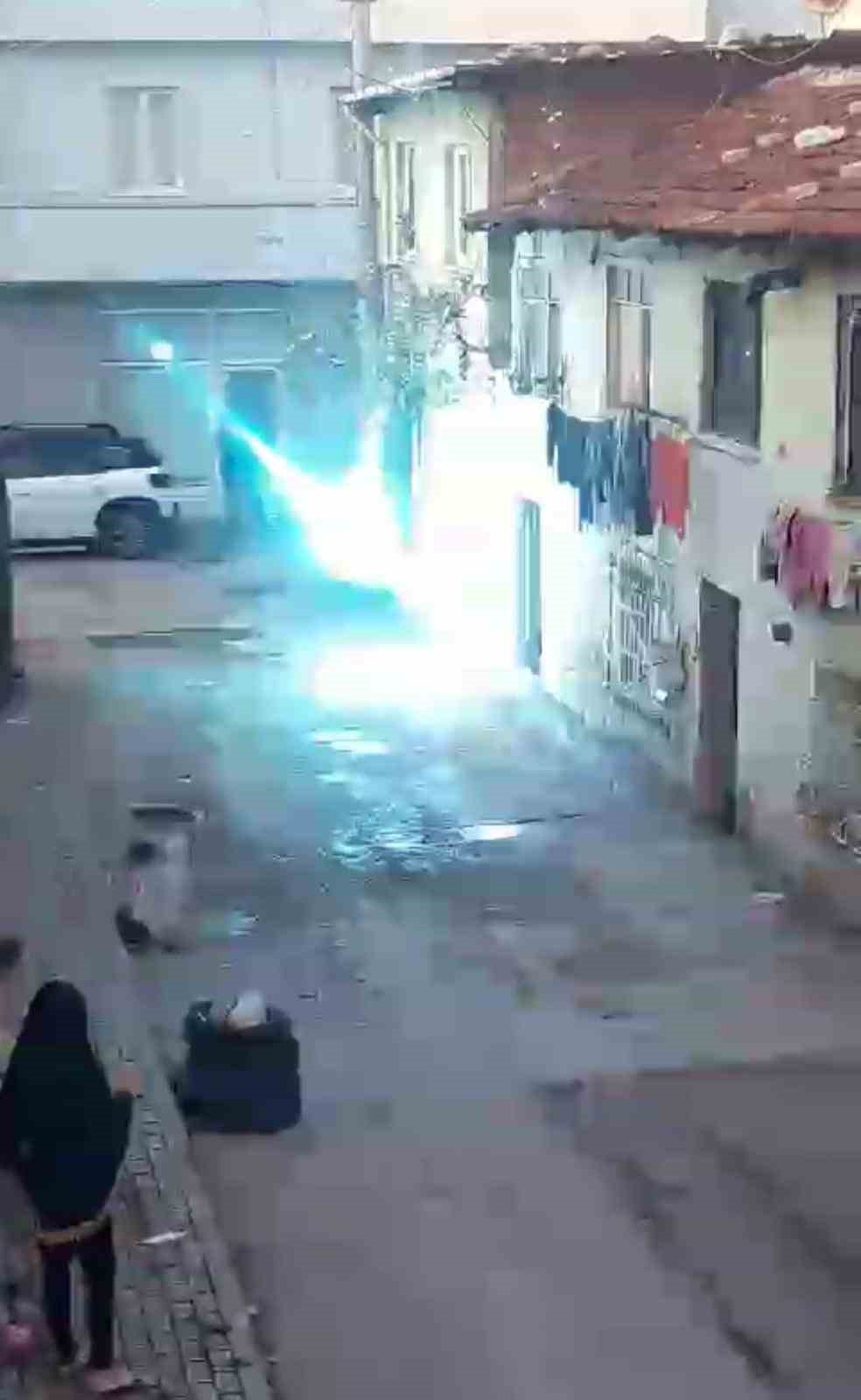 Bursa’da bir sokaktaki elektrik teli kıvılcım çıkarmaya başladı. Arızayı ve patlamaları gören bir kadın ise o anları cep telefonuyla kayda alırken, kopan kablo kadının bulunduğu yere düştü.